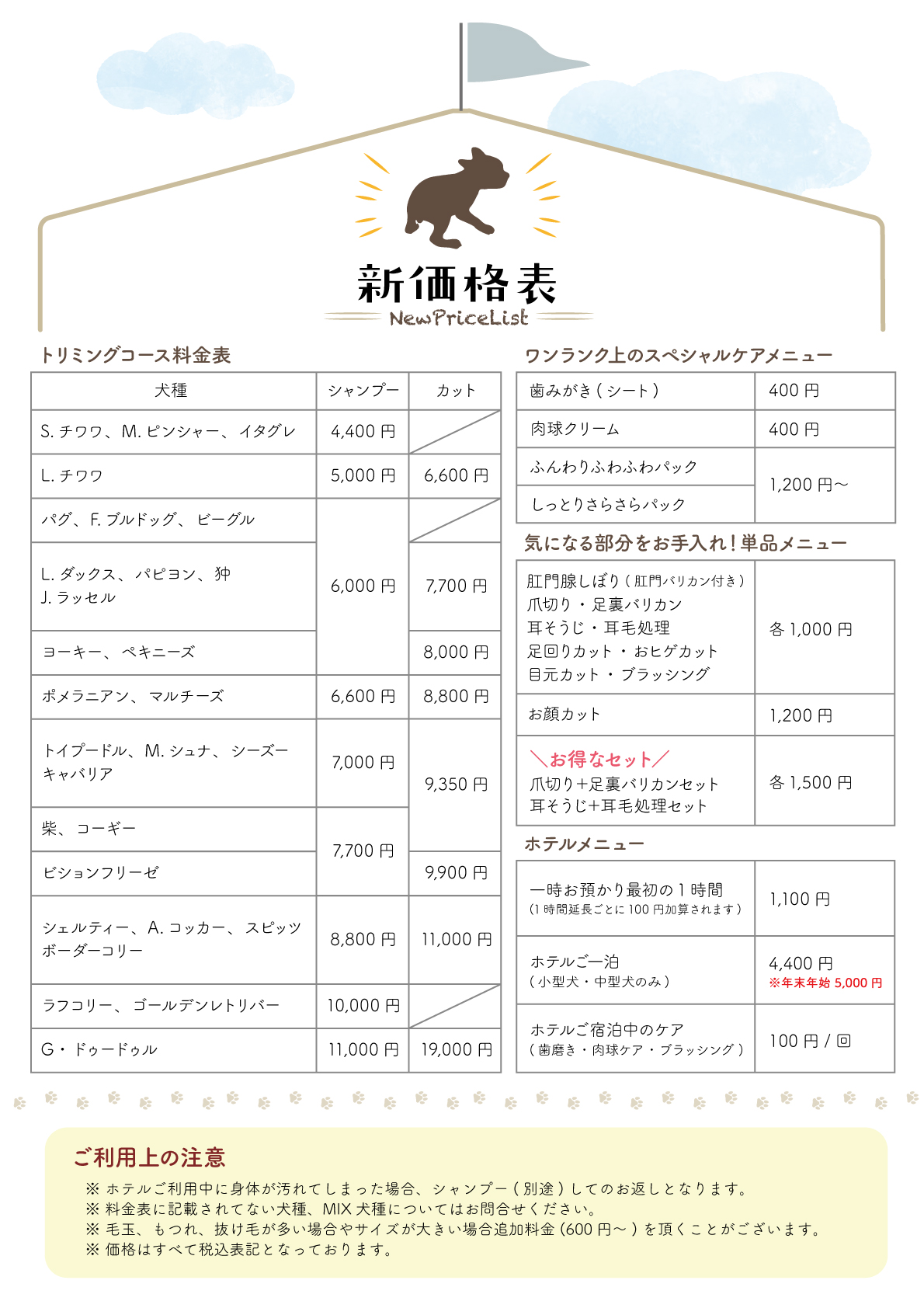 料金表に記載のない犬種、MIX犬種の場合は当店まで一度お問合せ下さい。