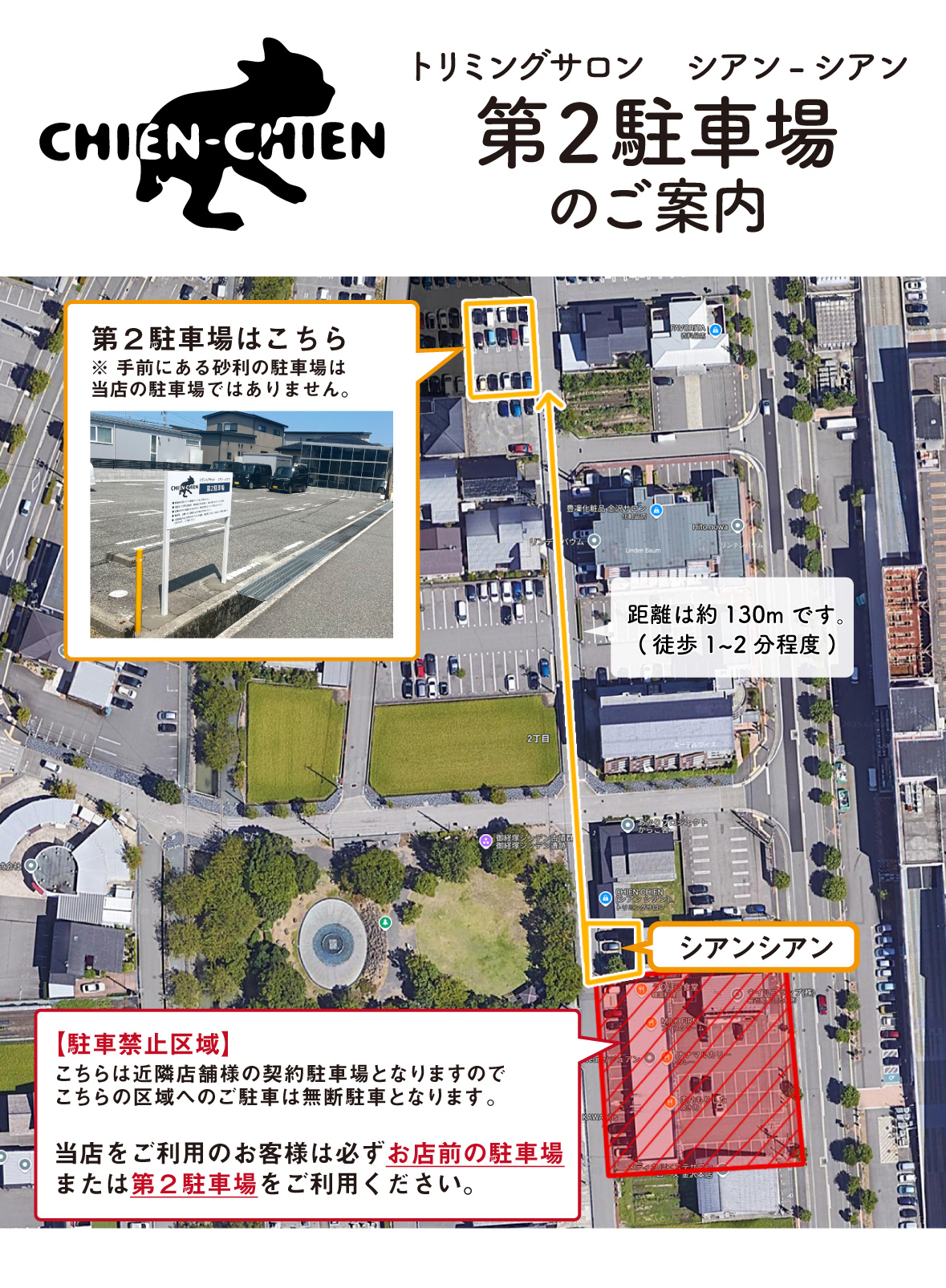 お店前の駐車場が満車の場合は、必ず第二駐車場へ駐車頂きますよう、お願い申し上げます。
